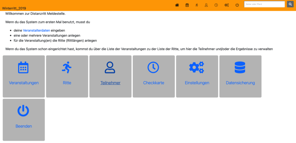 In der Meldestelle kannst du mehrere Veranstaltungen eingeben (das ist i.d.Regel 1 Rittwochenende). Zu jeder Veranstaltung kannst du mehrere Ritte erstellen. Zu jedem Ritt gibt es mehrere Kontrollpunkte. Außerdem gibt es zu jedem Ritt mehrere Teilnehmer. Ein Teilnehmer wiederum hat 1 oder mehrere Pferde (und 1 Reiter).