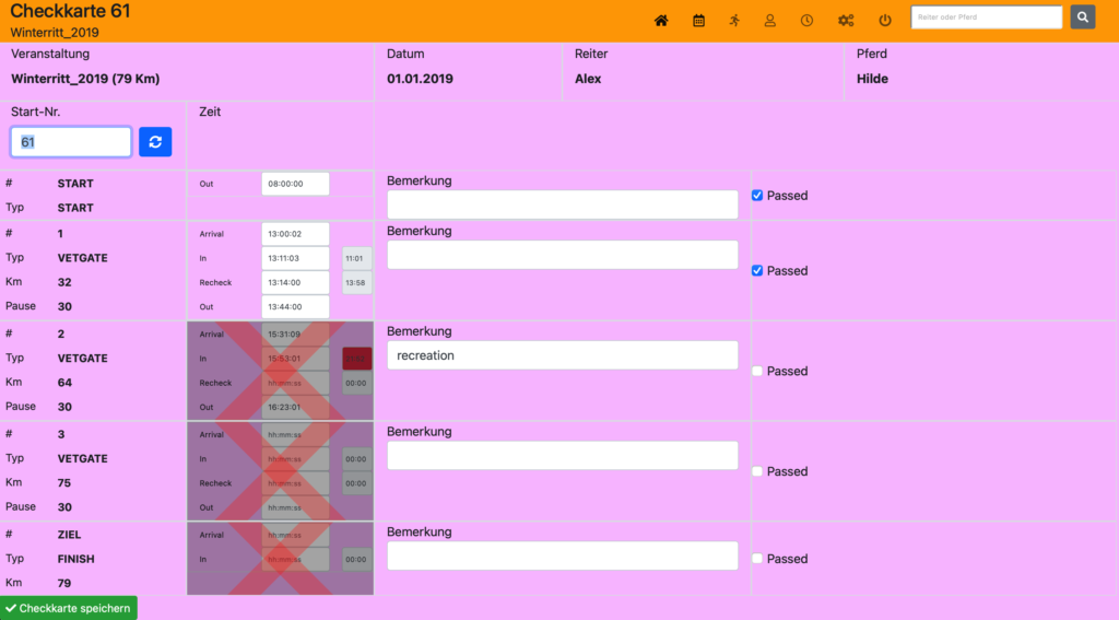Ein Ritt hat mehrere Kontrollpunkte. Das sind alle Punkte, die Werte auf der Scheckkarte haben (Vor- und Nachuntersuchung, Vetgates, Radar, etc.).
